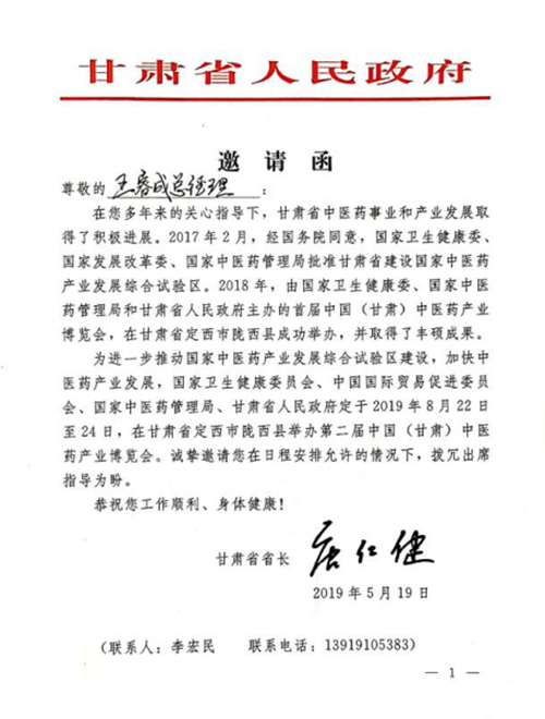 2019年7月4日下午,甘肃省定西市各级领导莅临开云kaiyun官方在线入口,在座谈会上,定西市人大常委副主任王成文给王睿成总经理亲手递交了甘肃省人民政府唐仁健省长亲笔签名的邀请函,诚挚邀请我司总经理王睿成参加于2019年8月22日至24日在甘肃省定西市陇西县举办的第二届中国(甘肃)中医药产业博览会。 甘肃中药材资源得天独厚,是全国重要的中药材主产区和道地药材生产地之一,素有“千年药乡”“天然药库”之称。紫光辰济药业将以药博会为契机,加强与中医药产业同仁的合作与交流,提升紫光辰济的品牌影响力,以实际行动进一步释放中医药产业潜力和活力,彰显中医药的多重价值,为推动健康中国建设、构建人类命运共同体作出新的更大贡献。 我司总经理王睿成对定西市政府人民政府各级领导的到来表示诚挚的欢迎,感谢甘肃省人民政府的邀请,并表示紫光辰济药业将联合宝鸡市中医药产业联合会各会员单位以最大的诚意和行动参加此次盛会,共同推进中医药产业的全面发展,预祝第二届中国(甘肃)中医药产业博览会圆满成功!